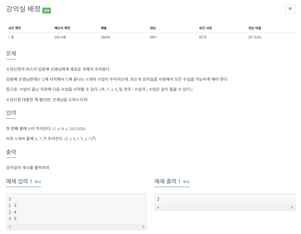 1. sort함수를 사용해서 시작 시간이 빠른 순서로, 시작 시간이 같다면 강의 시간이 짧은 순서로 정렬했다.