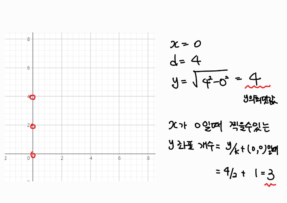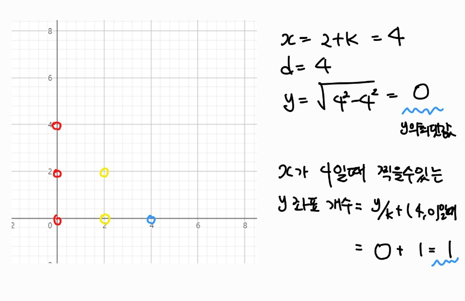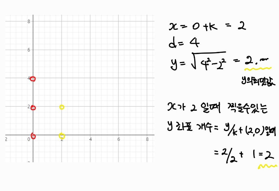 3. 2번에서 계산된 y^2에 제곱근을 구한 값이 해당 x에 대한 y의 최댓값이다. 이 y값을 k로 나누어주면 해당 x값으로 찍을 수 있는 y 값 좌표의 갯수가 나온다. 이때 나눗셈으로 계산하기때문에 y가 0일때가 제외되므로 계산된 값에 +1을 해준다.