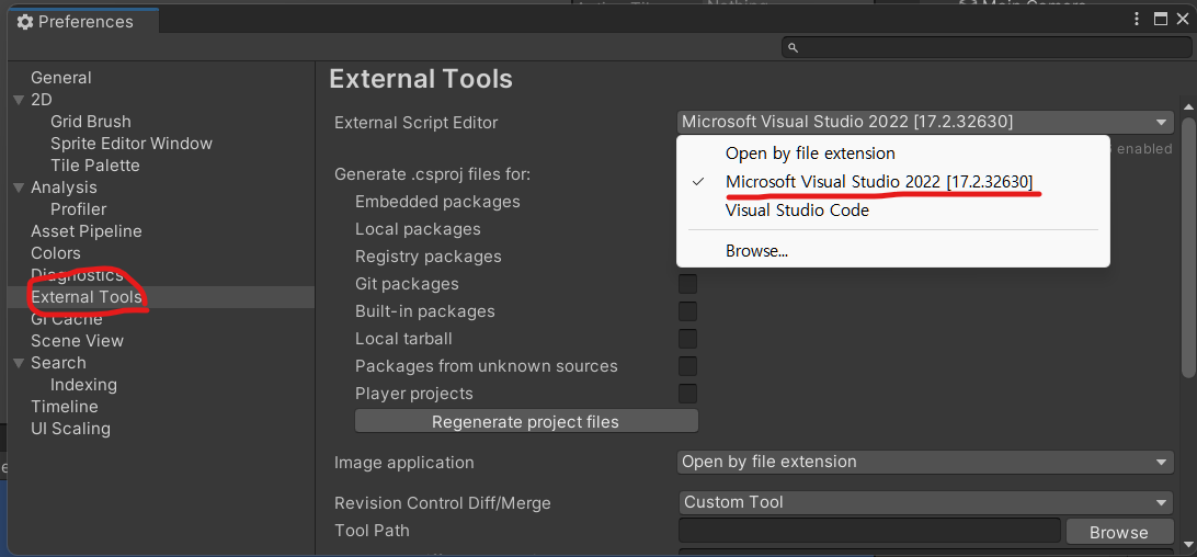 Preferences창에서 External Tools탭을 누르고, External Script Editor를 눌러서 Visual Studio를 선택한다.