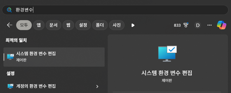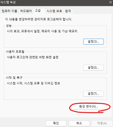 1. Windows 키 → "환경 변수 편집" 또는 "Edit the system environment variables" 실행